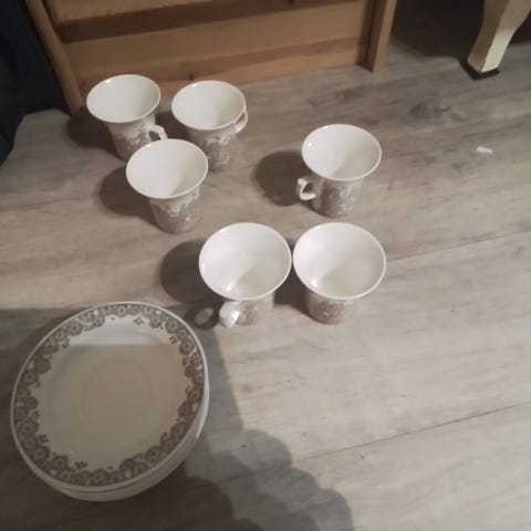 Mukana myös kermakko ja sokerikko. Myös kahvipannu löytyy. Kahvikupit, tassit ja pullalautaset, 10 kpl kaikkia. Osassa kuvio haalentunut ilmeisesti tiskikoneen aktiivisen käytön jäljiltä, ks kuva. Kysy lisätietoja kunnosta.