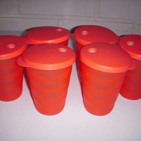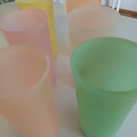 5 kpl erivärisiä muovimukeja,3 taitaa olla tupperwarea.käytettyjä mutta täysin ehjiä. Yhteensä 5 e.