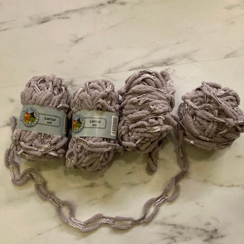 Kolme uutta lanka kerää 87% acrylic ja 13% polyester. Väri hento vaalea.