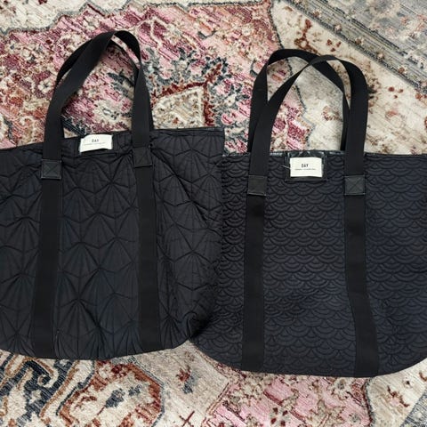 Day et Drape Shopper musta kangaslaukku. Uusi, laput vielä kiinni. Mitat: 35 x 45 x 17 cm. Tilava, tikattu, kevyesti topattu laukku. Kaunis kangaskuvio. Laukku suljetaan vetoketjulla, sisäpuolella on vetoketjutasku. Kantokahvat ovat tukevaa ja kestävää canvasta.