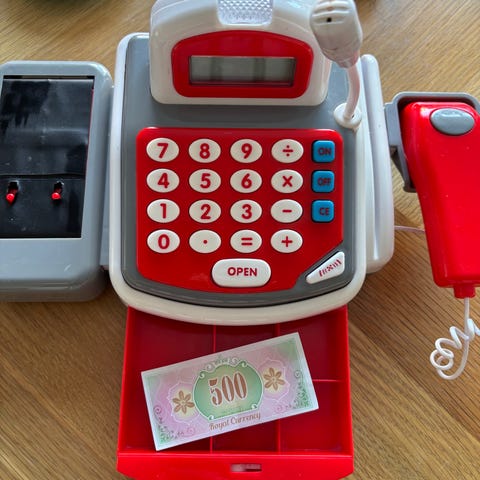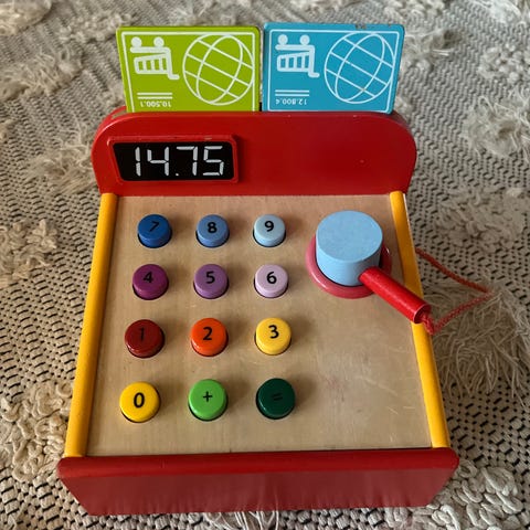 -Ääntä pitävä/laulava hedelmien/numeroidem opetus Kassakone + ostoskori ”ostoksineen”. Kassakoneen luukku valitettavasti jumissa, taakse on tainnut livahtaa leikkikolikko. 10€