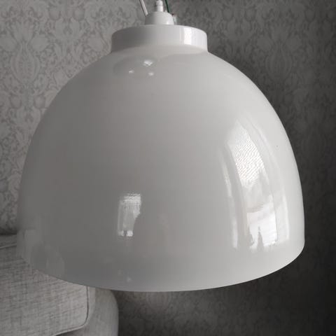 Lasikuvullinen valaisin metallikoristein. Kaksi hehkua. Halkaisija n. 30cm. Ehjä, hieman pölyinen.