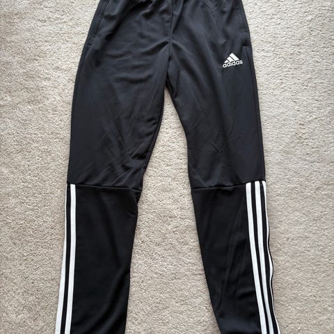Adidas lasten housut, koko 164, musta väri, unisex. Housuissa on joustava vyötärö ja Adidas-logo sekä kolme valkoista raitaa sivuilla.