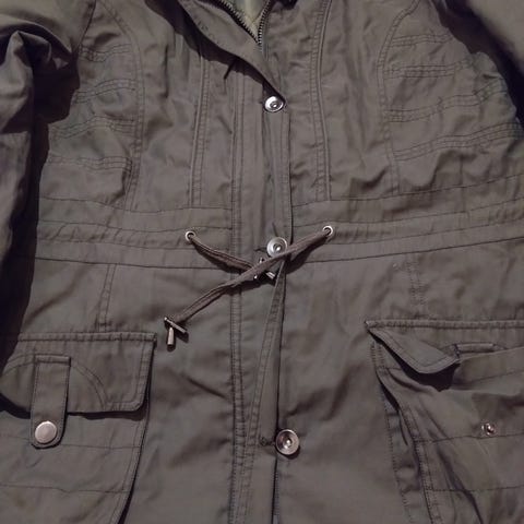 Valkoinen talvitakki, punainen reunat ja napit. Vähän käytetty ja pieneksi jäänyt. Pesu jää ostajalle.