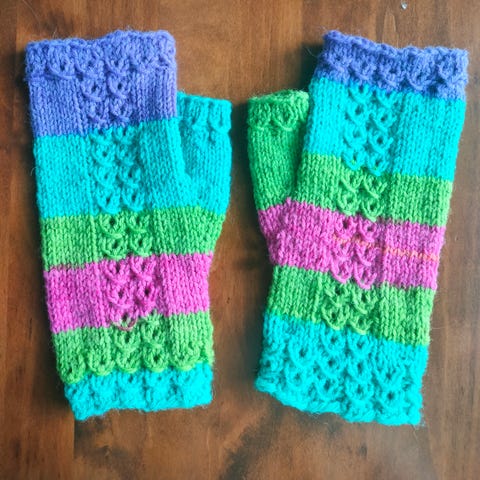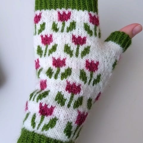 Kämmekkäät, koot S-M, lanka 75% villa 25% polyamidi. Hinta 20e + pk