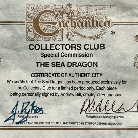 Enchantica The Sea Dragon keräilyfiguuri-sarja valmistettu Englannissa. Tämä yksityiskohtainen figuuri on osa Collectors Club -erikoiskokoelmaa ja sisältää aitoustodistuksen. Monivärinen lohikäärme tuo näyttävyyttä mihin tahansa kokoelmaan tai sisustukseen.