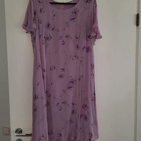 Juhlamekko, johon ommeltu kerroksittain kankaat. Sivussa vetoketju. Vuori. Ulottuu polven alapuolelle.