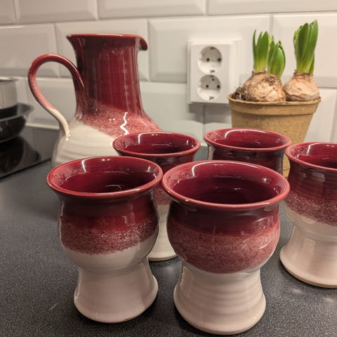 Kolme kappaletta musta /vihreä keramiikka mukia, sokerikko ja kermakko.