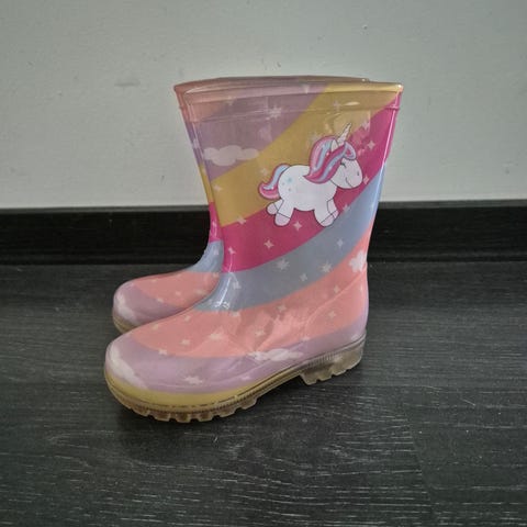 Yhdellä lapsella käytetyt, ehjät kumpparit. Huippuhauskat välkkyvät kantapäät. Ulkopintaan tarttunut hieman värjäymää, mutta muuten kunto hyvä.