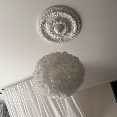 Valkoinen, metallinen kattovalaisin . Halkaisija noin 40cm.