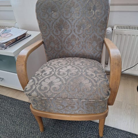 Nojatuolien istuintyynyt on verhoiltu vaalealla kankaalla. Istuin- ja selkänojatyynyjen lisäksi kummassakin nojatuolissa on irrallinen koristetyyny. Kaikkien tyynyjen verhoilut on ehjät ja siistit.