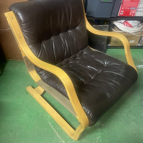 Myydään kaksi Carl-Gustaf Hiort af Ornäsin suunnittelemaa Rialto-nojatuolia. Nojatuolien puuosat on tummanruskeat. Käsinojissa on tummanruskeat nahkakierteet. Selkänojassa on vaaleanruskeat nahkapunokset. Kummastakin nojatuolista on yksi nahkasoiro katkennut selkänojan nahkapunoksesta. Puuosien liitokset on hyvässä kunnossa ja nojatuolit on tukevat istua.