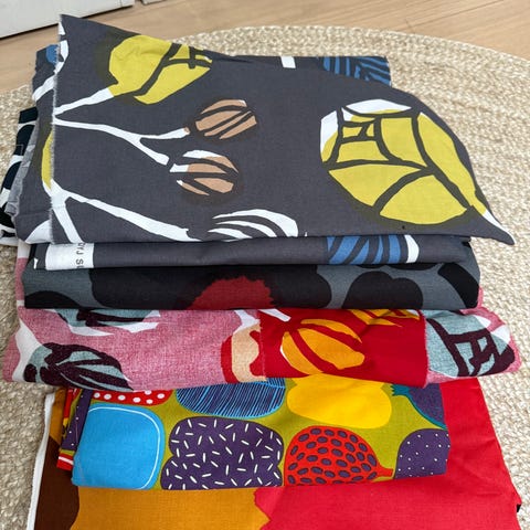 26 kpl kuvan mukaisia Marimekon kangastilkkuja Jenni Tuomisen Taapeli-kuosista. Leveys 143 cm ja korkeus vähän vaihdellen mutta noin 40 cm, eli kangasta on yhteensä yli 10m. Uusia ja siten erittäin hyväkuntoisia kaikki.