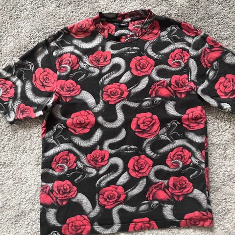 Musta pitkä paita harmaalla ruusukuviolla, koko DE44. Hyvä käytetty kunto. Ruusukuvio on tarkoituksella "kuluneen näköinen".