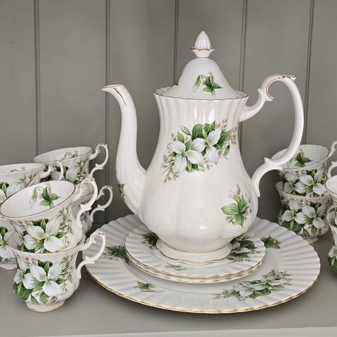 Erittäin hyvässä kunnossa. 6 teekuppia, 6 teelautasta, 6 leipälautasta. Kermakko, sokerikko, iso tarjoiluvati ja iso teekannu. Vain nouto.