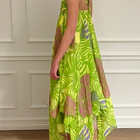 Polviin asti ylettyvät mekko/tunika. Harvoin tarjolla. Samu-Jussi Kosken desing 2000-,luvun alusta. Ry. ja vyötärö 100 cm. Pituus 80 cm. Puuvilla-silkkisekoitetta, polyester vuori. Pohjaväri petrooli, kuviointi musta ja tummanharmaa. Vetoketju sivussa. Hihoissa kivat poimitukset.
