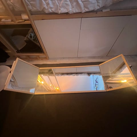 Peili ollut nostettuna tuolle valkoiselle hyllylle ja yllä ollut kiinnikkeenä meikkivalokiskot music Ikea. Tuollaisenaan käyttöön tai muuten.