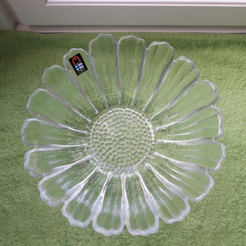 korkeus n.5cm, yläosan halkaisija ulkomitta n.19cm, muutama kaunis ilmakupla terälehdissä, hyvin vähäistä jälkeä