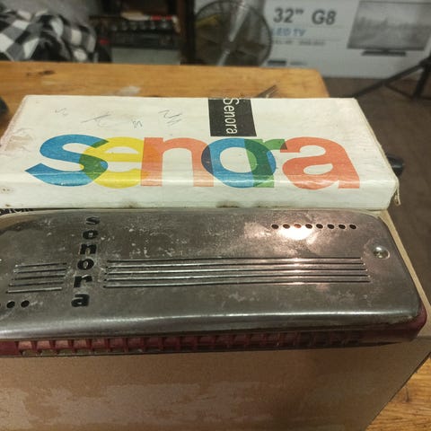 Vanha ja huoltoa vaativa huuliharppu. Merkki: Senora. Mitat: 6,5 x 19cm. (Nouto tai postituskulut lisätään hintaan).