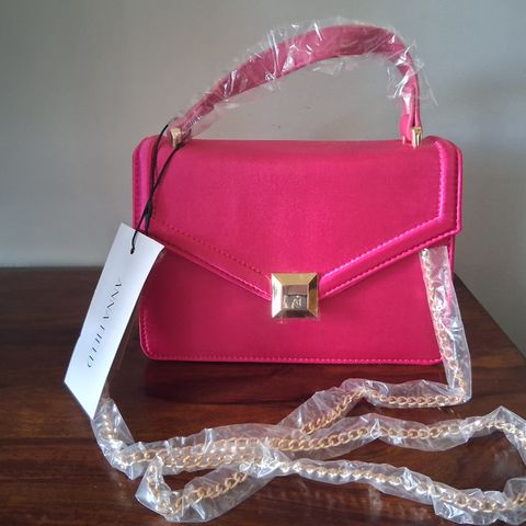 Myydään kerran häissä käytetty, valkoinen Anna fieldin laukku, jossa kultainen ketju.