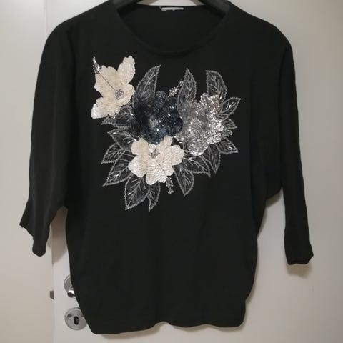 Lindex M kaunis, musta, verkkoneuloksinen paita. Hihat vuorettomat, läpikuultavat, muualla vuori. Mustia, pieniä koristepaljetteja. Kerrosleikkausvaikutelma. Halkiot helmassa. Selän pituus 58 cm. Kainalo-kainalo 110 cm. 100 % polyesteri/ vuori 100 % pv. Postimaksu 8,90e.