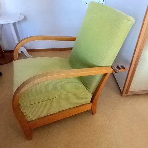 Kaksi 1930-luvun funkis nojatuolia, ikäisekseen hyvässä kunnossa. Tuolit ovat Einari Kyöstilän hotelli torni-tuolien aikalaiskopioita ymmärtääkseni, hieman matalammalla istuimella.