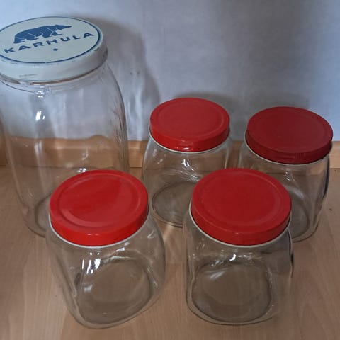 Riihimäen purkit lasikannella. 2kpl. 1/2 L ja 2kpl. 1/4L yhdessä kannessa kolhu. Koko satsi kympillä.
