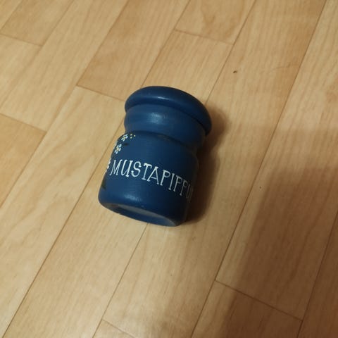 Noin 10,5 cm korkuinen puinen purkki ja sen kansi.