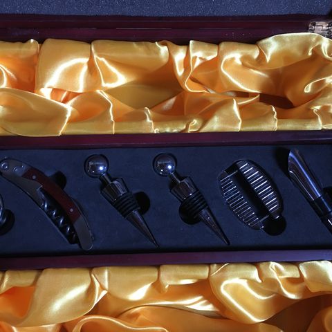 Viini setti kannellisella säilytyskotelolla. Setistä on ainoastaan korkkiruuvia käytetty kerran tai kaksi.