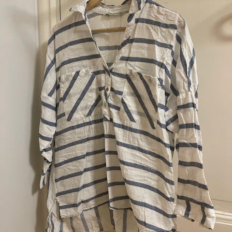 Käytetty kerran, uudenveroinen. Pienen pieni materiaalivirhe paidan alaosassa (näkyy kuvassa), muuten virheetön. 100% puuvillaa, kangas hieman läpikuultavaa. Koko M. Pituus selästä mitattuna 51 cm, hihan pituus 55 cm.