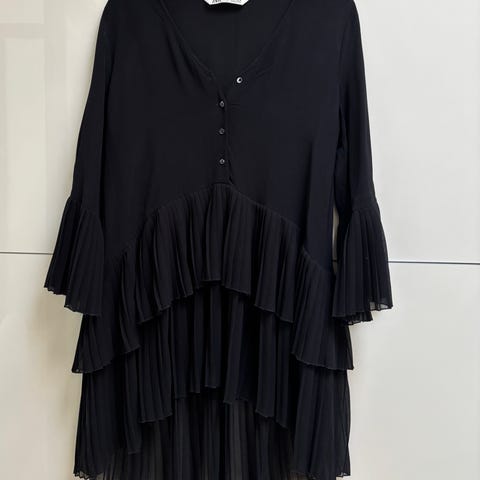 Musta pitsimekko / tunika jossa röyhelöhelma, koko S, vastaa kokoa XS / S, 36 / 38.