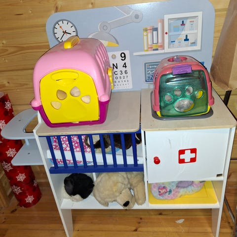 Myydään lasten vauva/eläinhoitola jossa pesupiste ja vauvaeläinten syöttötuoli.