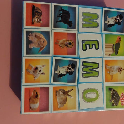 Muistipeli, 36 muistipelikorttia. Kortit ovat todennäköisesti puisia ja niissä on villieläinten kuvia. Kuvissa käytöstä johtuvaa kulumaa. Ikäsuositus 3+