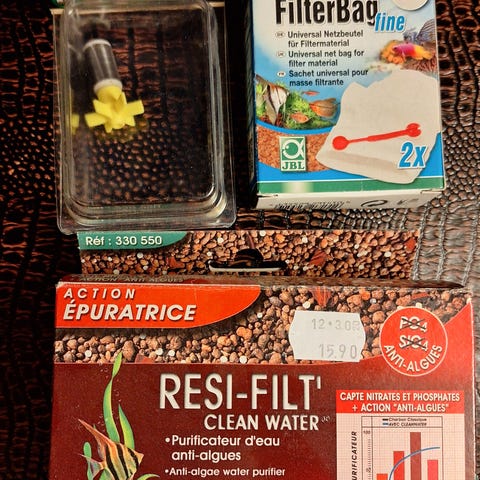 Akvaariotarvikkeita Resi-Filt + pussit sekä varaosa potkuri