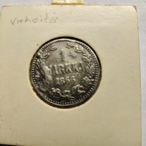 Suomi 1 Markka 1874 hopearaha, jossa näkyy rahan etu- ja takapuolen yksityiskohdat. Rahan paino ja koko eivät ole tiedossa. Rahan etupuolella lukee '1 MARKKA 1874' ja takapuolella on Venäjän keisarikunnan vaakuna sekä teksti venäjäksi.