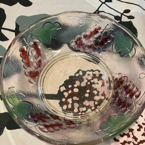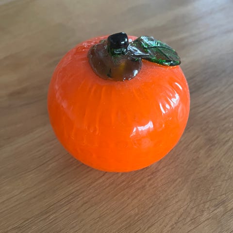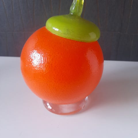 Lasihedelmä, appelsiini. Ilmeisesti lehtiosasta irronnut kanta. Irronnut niin tasaisesti, ettei oikeastaan huomaa. Itseä ei ole vaivannut tuo vika. Huomioitu hinnassa.
