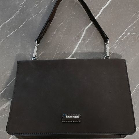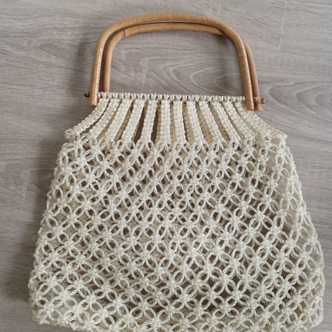 Virkattu, musta vintage laukku. Rottinkikahvat. Vuori kellastunut ja osin rikki.
