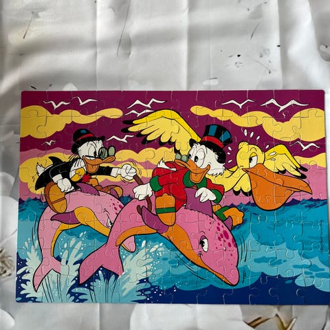 Vuosia vanhoja erilaisia ja erikokoisia Aku Ankka -aiheisia palapelejä. Kaikki ehjiä ja hyväkuntoisia. Aku Ankka ostoksilla - vuosikymmeniä vanha Paletin palapeli. Täysin ehjä ja siisti. Koko 30cm x 21cm. Suurimman koko 37cm x 26cm.