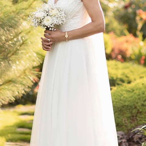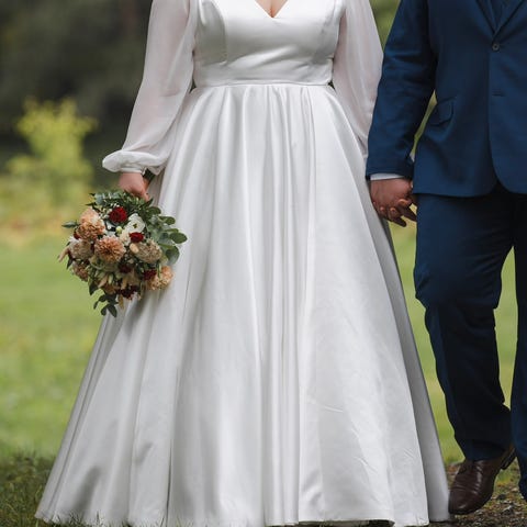 Ylellinen hääpuku mikadosatiinia. V-pääntie, istuva yläosa, avoin selkä, taskut ja upea laaja helma. Pitkät ilmavat hihat, jotka saa siististi otettua pois vaikka kesken juhlien. Yksissä juhlissa käytetty ja pesetetty pesulassa. Ompelijalla muokattu helman pituutta ja olkapäiden pituutta. Sävy ivory (off-white). Alla kolmevanteinen vannehame, joka kuuluu hintaan.