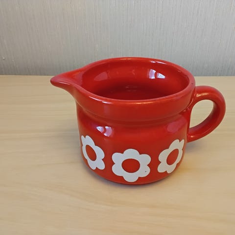 Myyntiin ehjä kermakannu / kermakko / maitokannu 70-luvulta. Kannun korkeus on 7,5 cm ja tilavuus noin 2 dl.