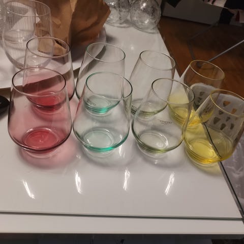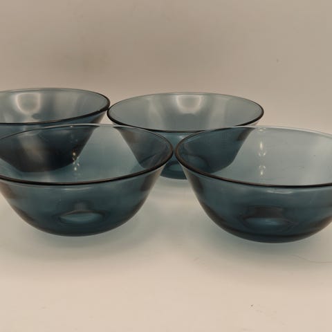 5 kpl noin satavuotiaita jälkiruoka astiaa. Korkeus 7 cm, leveys 10 cm. 1 ruskea, 2 vihertävää ja 2 kirkasta. Ohutta lasia