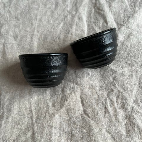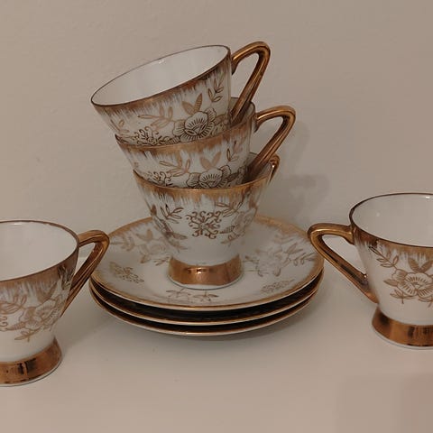 Käyttämättömät 6kpl teemukit/aluslautaset omassa laatikossa.