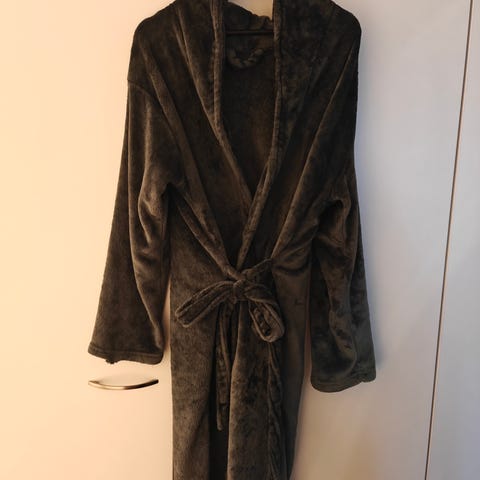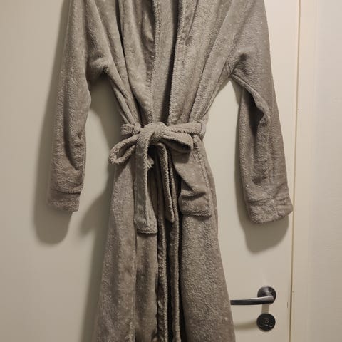 Cubuksen vaalenaharmaa/valkopilkullinen hupullinen kylpy/aamutakki fleeceä, hyvin vähän käytetty.