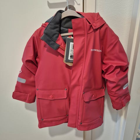 Tuulen- ja vedenpitävä takki, teipatut saumat. Malli on A-linjainen ja siinä on resori vyötäröllä.