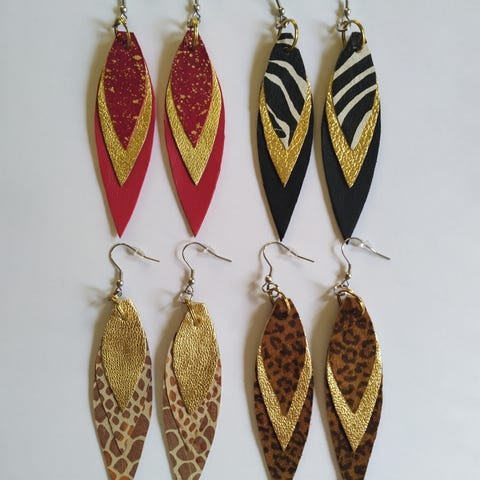 Uudet korvikset kuvionahkaa sekä kullanväristä nahkaa, koukut kirurginterästä, kevyet.