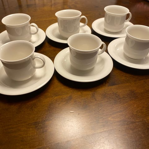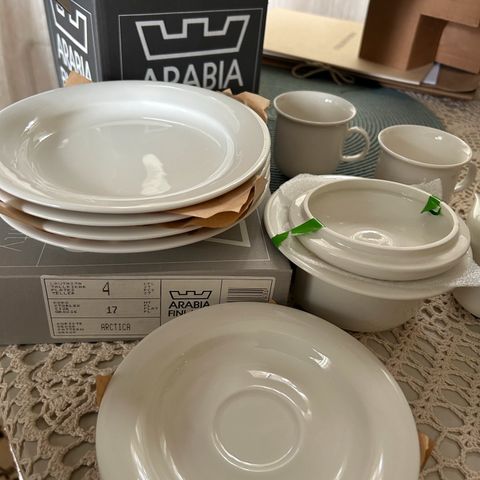 Myynnissä erittäin hyväkuntoiset Arabia Arctica 6 kpl kahvikuppia + 6 kpl lautasia.