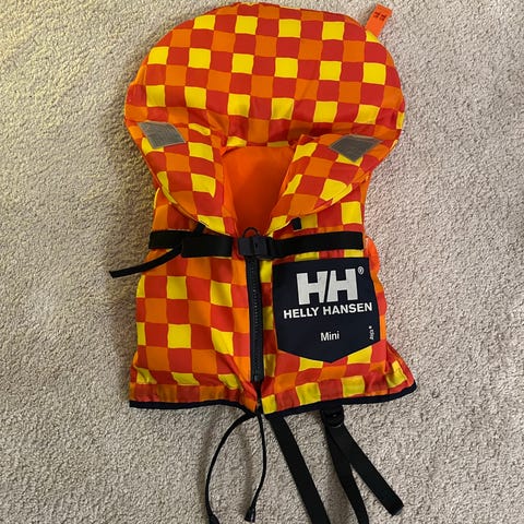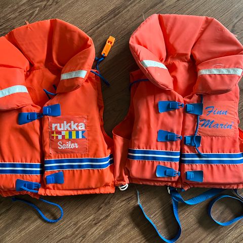 Retro lasten pelastusliivi. Liivi puetaan kaulaan, jossa ympärillä kellukkeet ja tulee vain rinnan etuosaan (ei selkäpuolelle), jossa paksut kellukkeet. Kiristys vyötärönauhalla. Toimiva pilli matkassa. Tullut ajan saatossa patinaa ja kosteuspilkkuja.