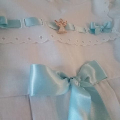 👗 Klänning, band, dopduk, fodrad mössa, strumpor med rosetter samt en guldfärgad, franskinspirerad änglabrosch (syns i sista bilden) totalt 78 e