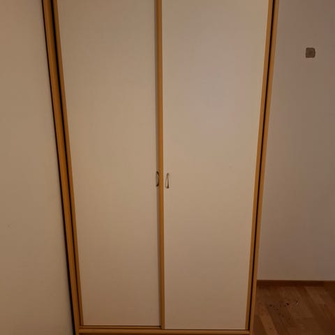 Kaksi kaappia on täyskorkeita eli erillisellä yläkaapilla, ja yhdestä on katon yläpalkin takia poistettu tuo yläkaappi. Ovien saranoita pitäisi säätää, mutten itse jaksa. Matalamman kaapin oven keskisaranan vastakappale on irronnut mutta tallessa.