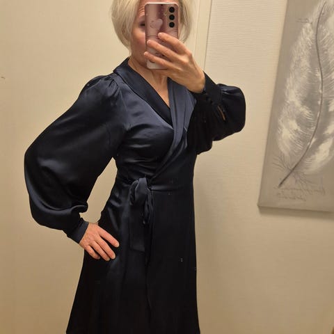 Yhden kerran käytetty upea juhlamekko. Mekossa on vuori ja vuorikankaaseen kiinnitetty helmatylli. Helmatylli ei ole koko helman pituinen mutta tuo helmaan ihanaa ryhdikkyyttä ja nättiä linjaa. Mekossa on vetoketjukiinnitys ja nyörit takana, jolla saa napakkuutta ja paranneltua istuvuutta. Materiaalit: puuvilla ja silkki